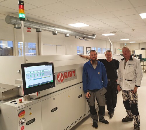 Inission Stockholm fortsätter satsa och har nyligen investerat i en ny SMT R320 reflowugn. Driftsäkerhet, låga driftkostnader samt rekommendationer från systerfabriken i Munkfors var några argument för att valet för på SMT och ESD-Center. På bilden syns Mats och Mattias Blomqvist på Inission Stockholm tillsammans med vår tekniker Magnus framför den nya ugnen.