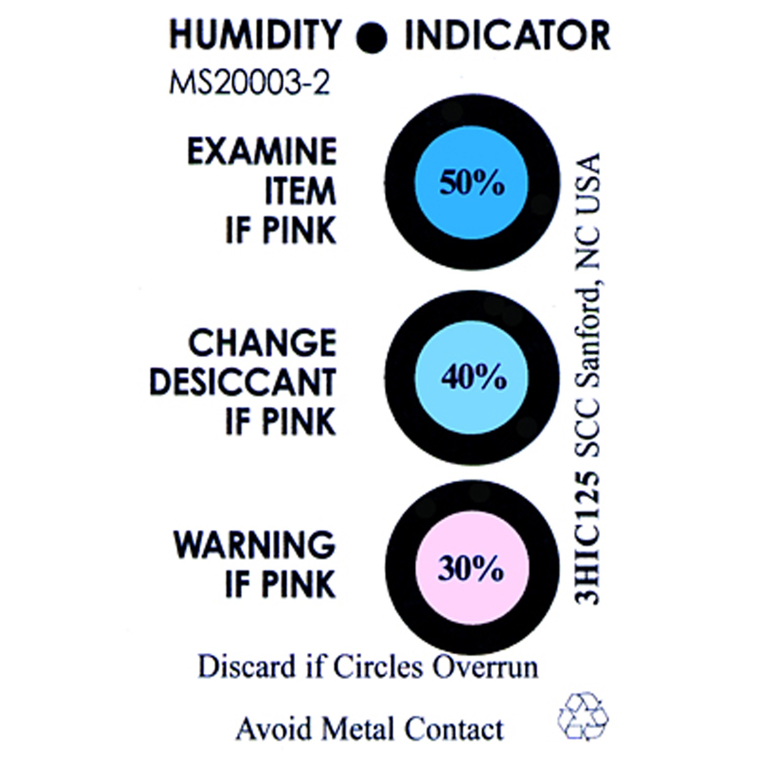 Humidity Indicator Cards visar hur mycket fukt emballaget innehåller. Kontrollera indikatorn direkt när emballaget öppnas att alla cirklarna fortfarande är blå. Är någon cirkel rosa, vidtag rekommenderad åtgärd.