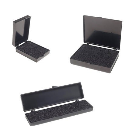 Komponentaskar tillverkade i svart konduktiv polypropylen med gångjärn, trysckt ESD-symbol och dissipativt skuminlägg.