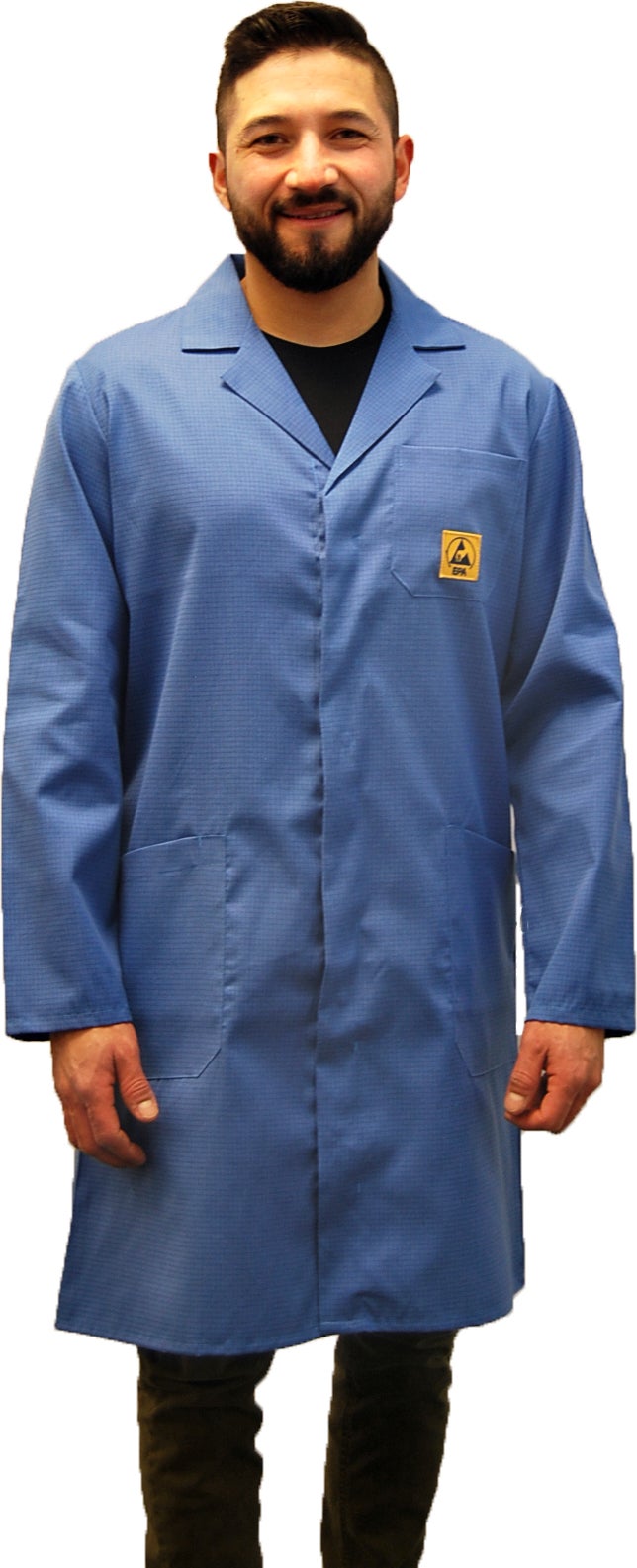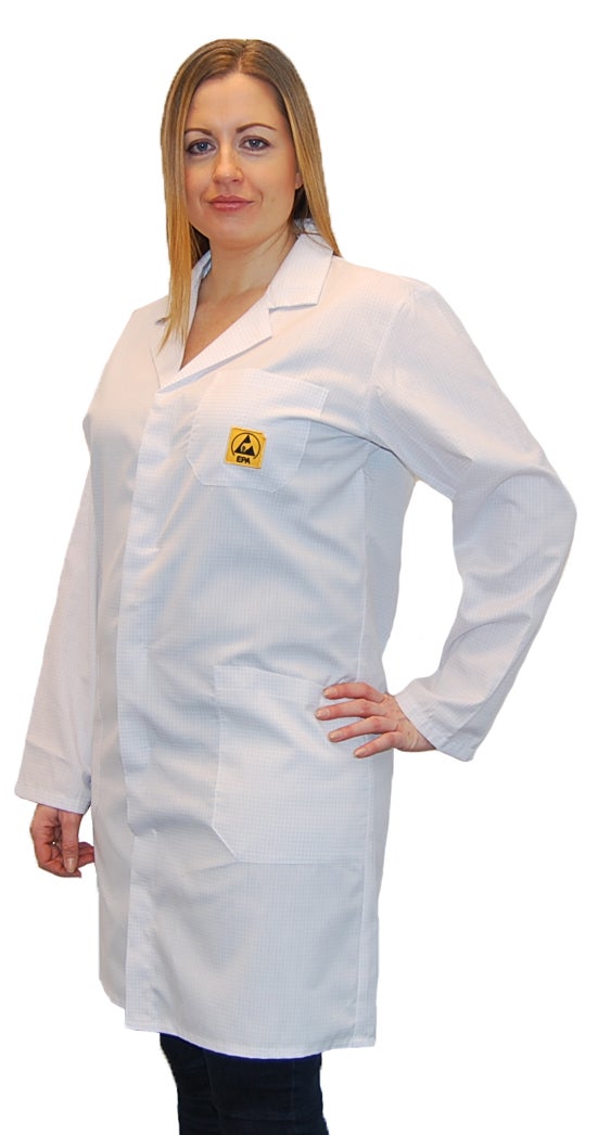 Denna långa ESD-skyddade rock är framtagen för att ge ett effektivt skydd mot statisk elektricitet i känsliga arbetsmiljöer. Rocken är lätt, ventilerande och har ett professionellt utseende som passar både män och kvinnor. Den är idealisk för användning inom elektronikproduktion, laboratorier och tekniska miljöer. Det statiskt dissipativa materialet innehåller konduktiva fibrer i ett rutmönster med 4 mm mellanrum som effektivt leder bort statisk elektricitet. Materialet är lätt och andas väl, vilket gör rocken bekväm att bära hela dagen. Modellen är unisex och passar både män och kvinnor, och ESD-logotypen på bröstfickan ger en tydlig märkning för EPA-zoner. Den långa modellen ger extra täckning och skydd, samtidigt som det professionella utseendet gör rocken lämplig både för tekniska och kundnära miljöer. Rocken är dessutom enkel att underhålla och kan tvättas i 60°C för att hållas fräsch och i gott skick.