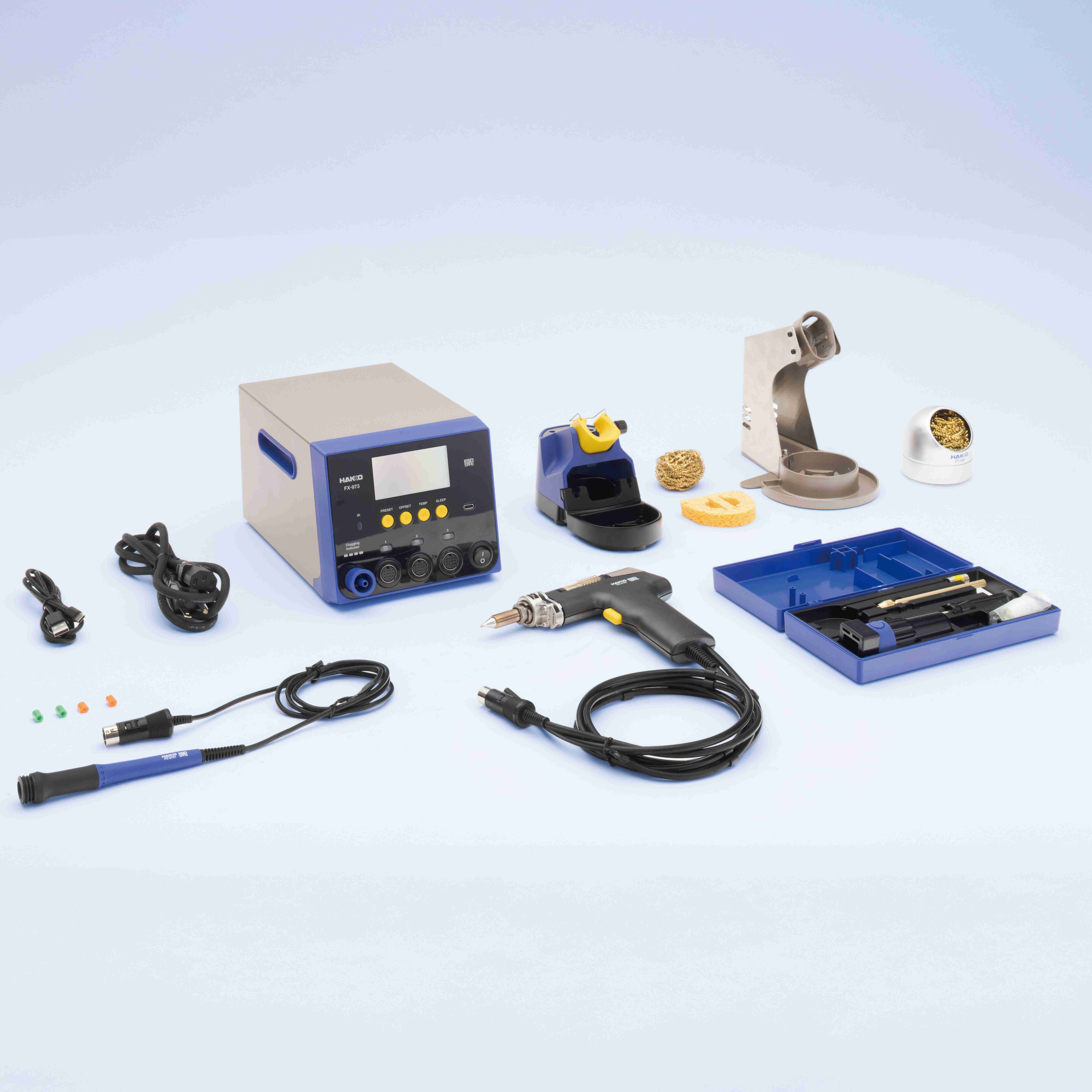 Avancerad reparationsstation med 3 kanaler. Totalt kan 9 stycken olika lödpennor, lödpincetter samt avlödningsverktyg anslutas, samtliga tillhörande Hakkos senast utvecklade teknik för optimal prestanda och ergonomi. Som standard medföljer verktygen FX-9701 samt FR-4103 med ställ.