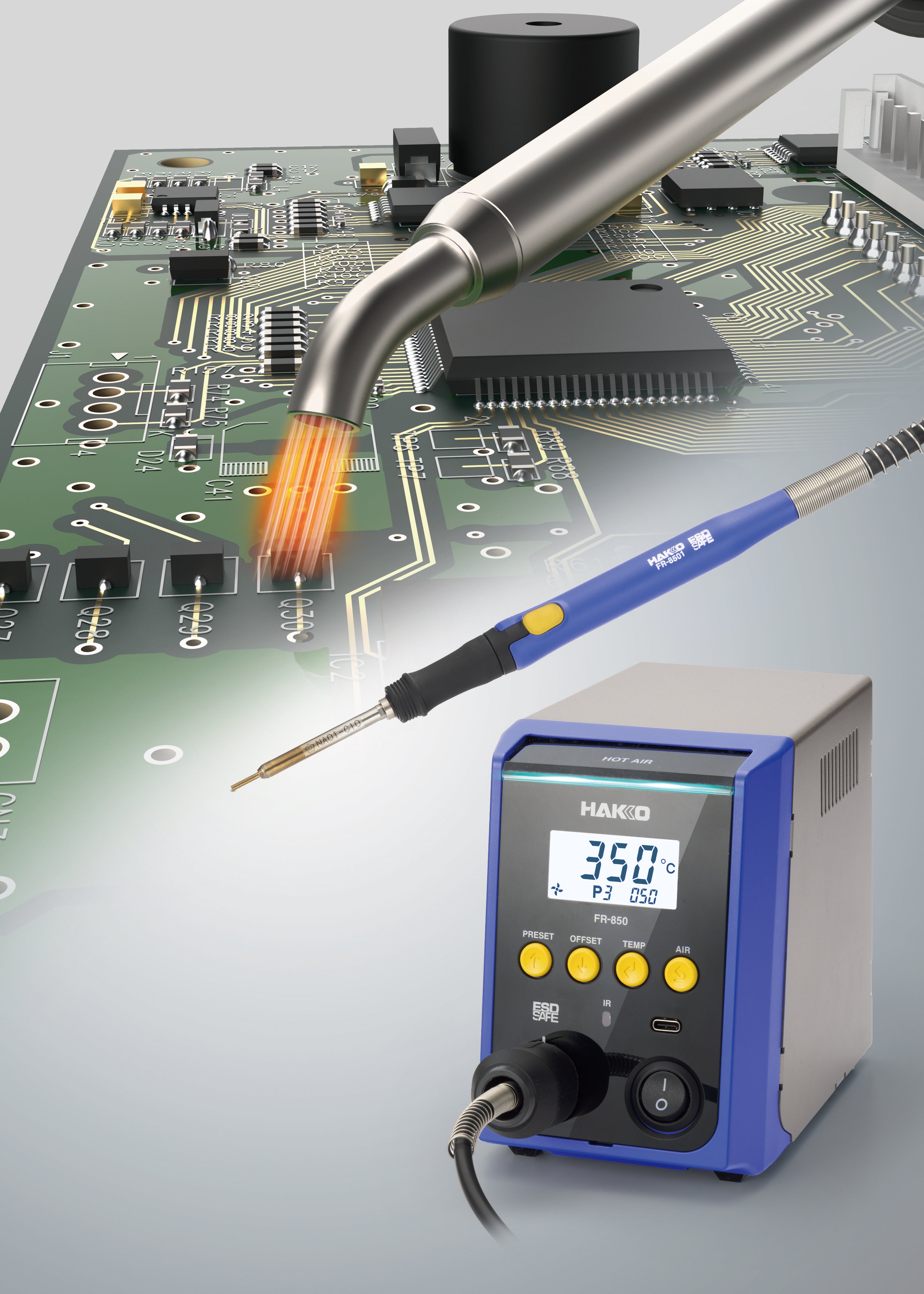 Varmluftsstation för i första hand ytmonterade komponenter. Flertal munstycken kan väljas beroende av komponenttyp som önskas plockas bort.